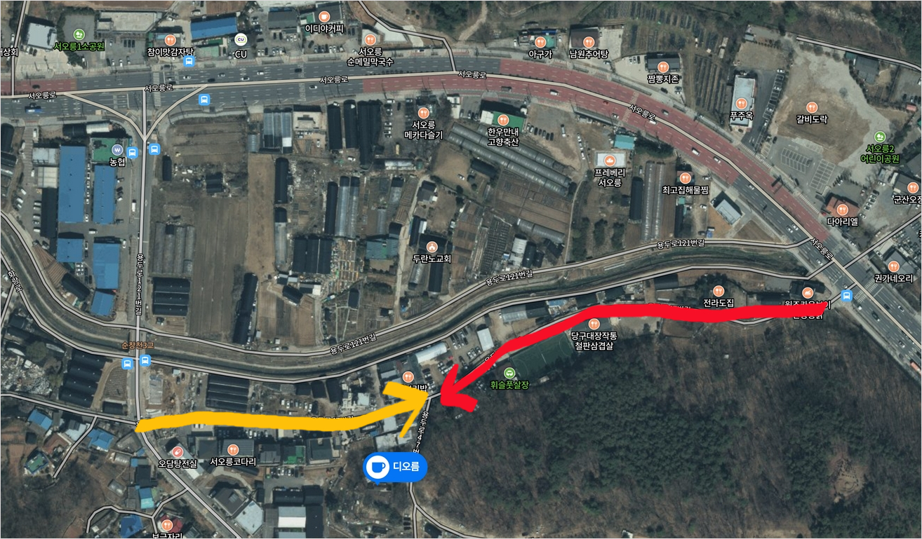 큰길에서 진입해서 들어가는 빨간색쪽과 한적한 도로를 지나 들어 갈 수 있는 노란색쪽이 있다.