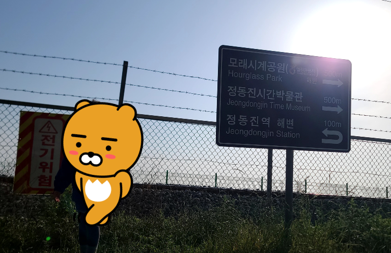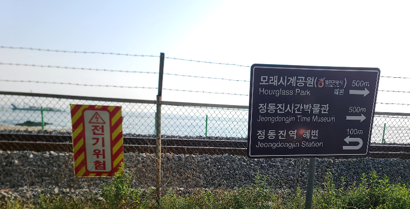 철조망 뒤로 해변과 철길이 보였다