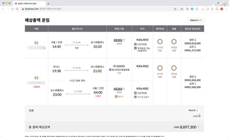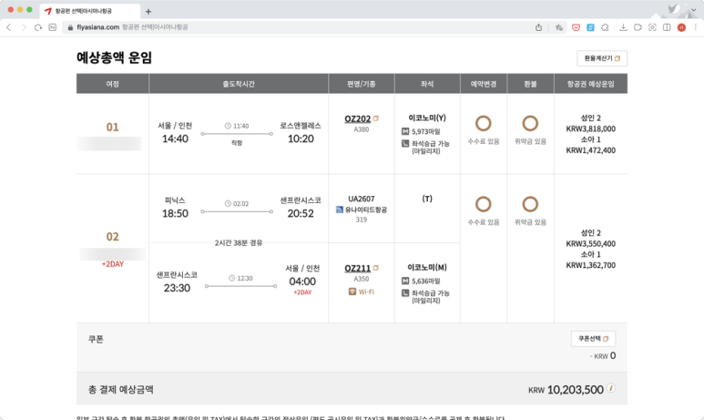 우리가 탈 아시아나항공 공홈에서는 약 천만원...