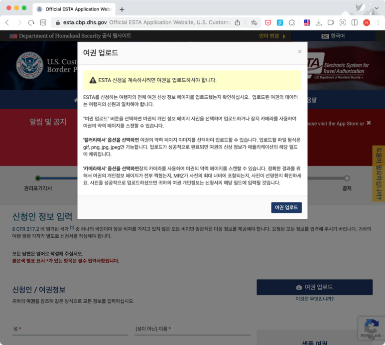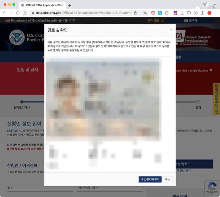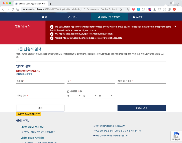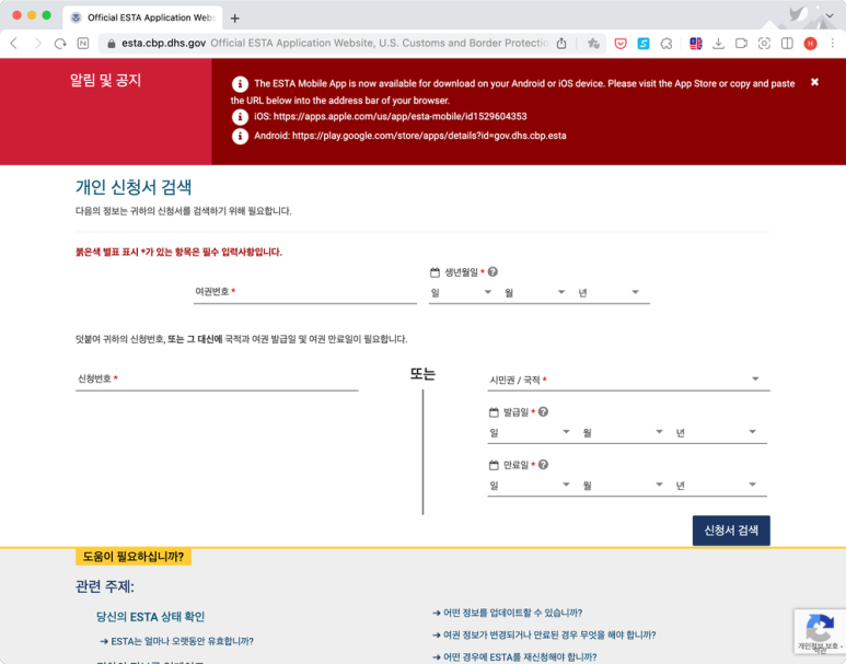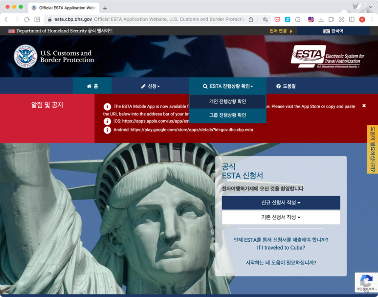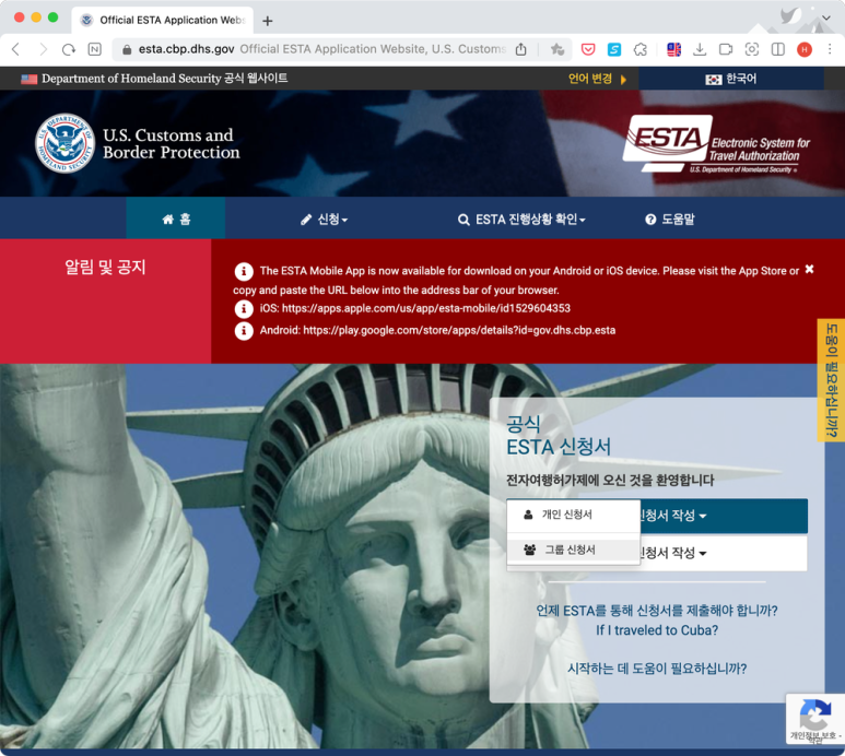 미국의 CBP(Customs and Border Protection, 미국관세국경보호청) 사이트로 연결이 되기때문에