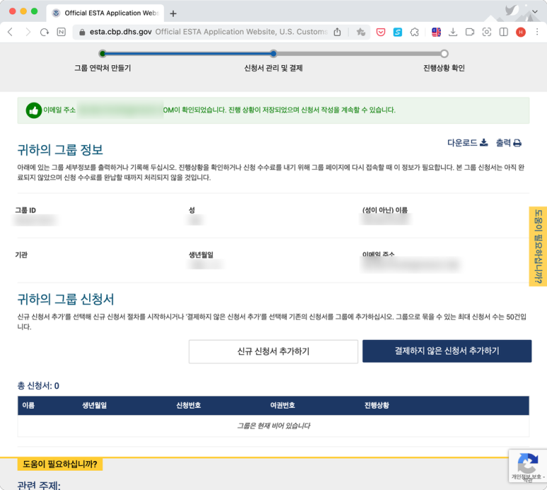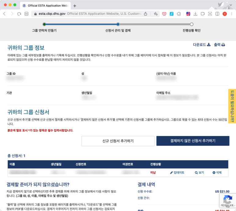 가족과 같이 그룹으로 신청하는 경우 위 페이지 하나 더 추가된다고 보면 된다