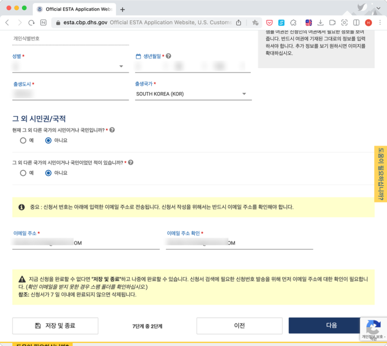 주민등록번호, 여권발급일자, 이메일 주소등을 입력하고 다음으로 넘어가자