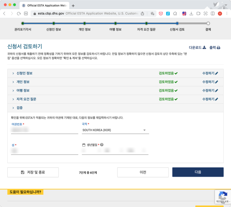 최종적으로 입력한 모든 정보에 대해 검토 과정이 나온다