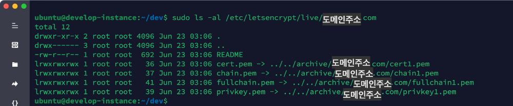 sudo ls -al /etc/letsencrypt/live/도메인.com
