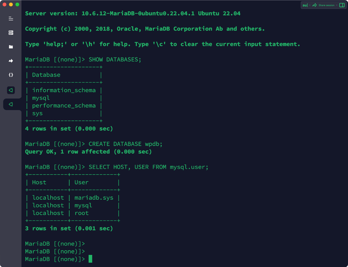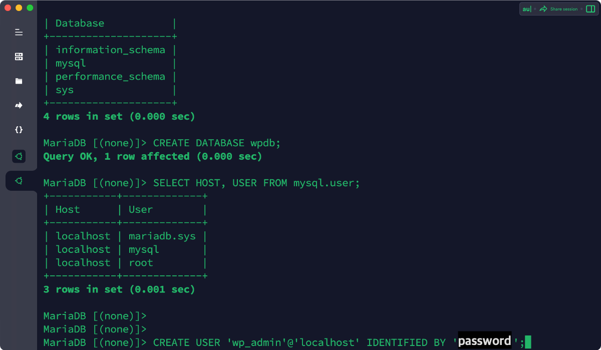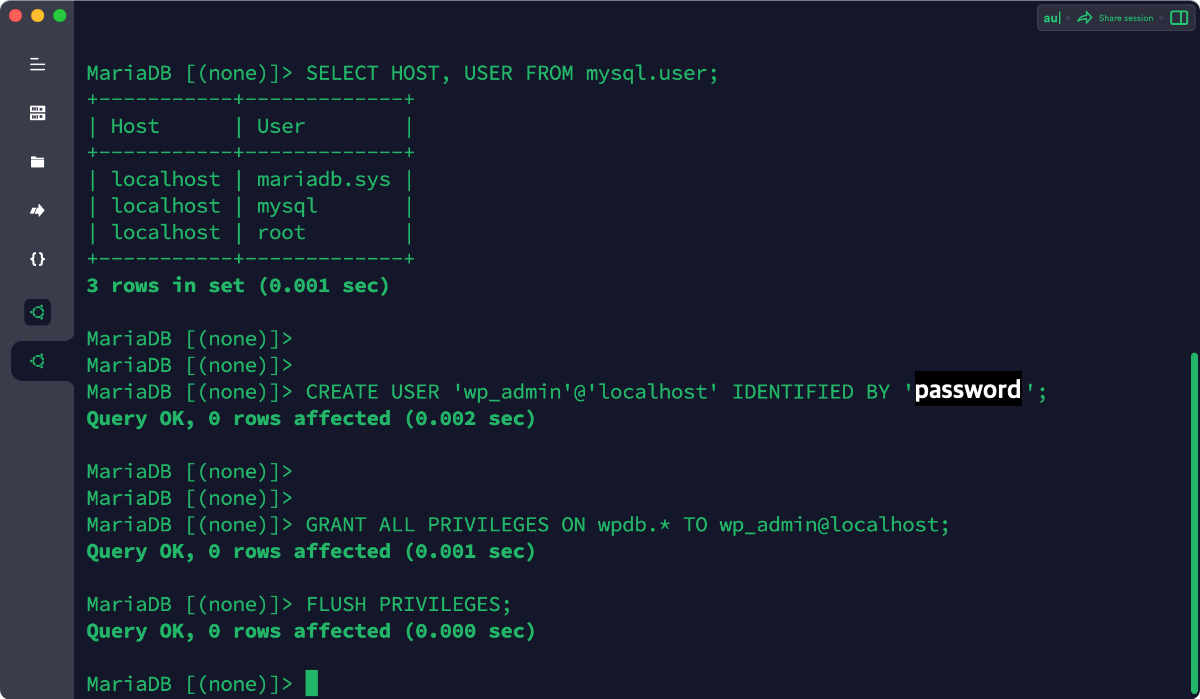 CREATE USER 'wp_admin'@'localhost' IDENTIFIED BY 'password';