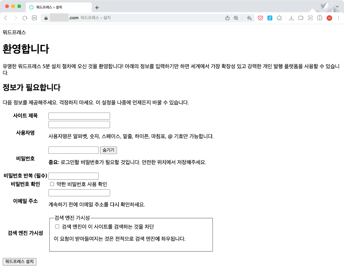 아래 화면이 나왔다면 워드프레스 설치에 성공한것이다