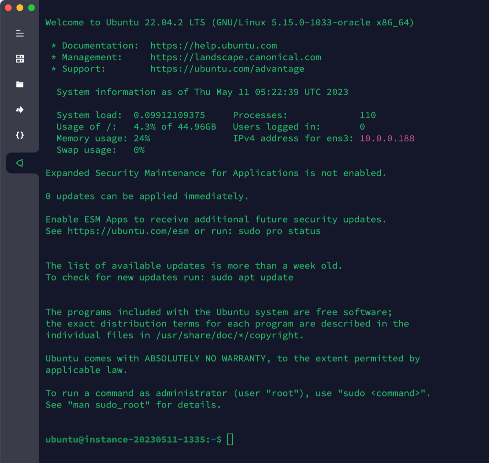 ssh -i .ssh/id_rsa ubuntu@123.45.111.222