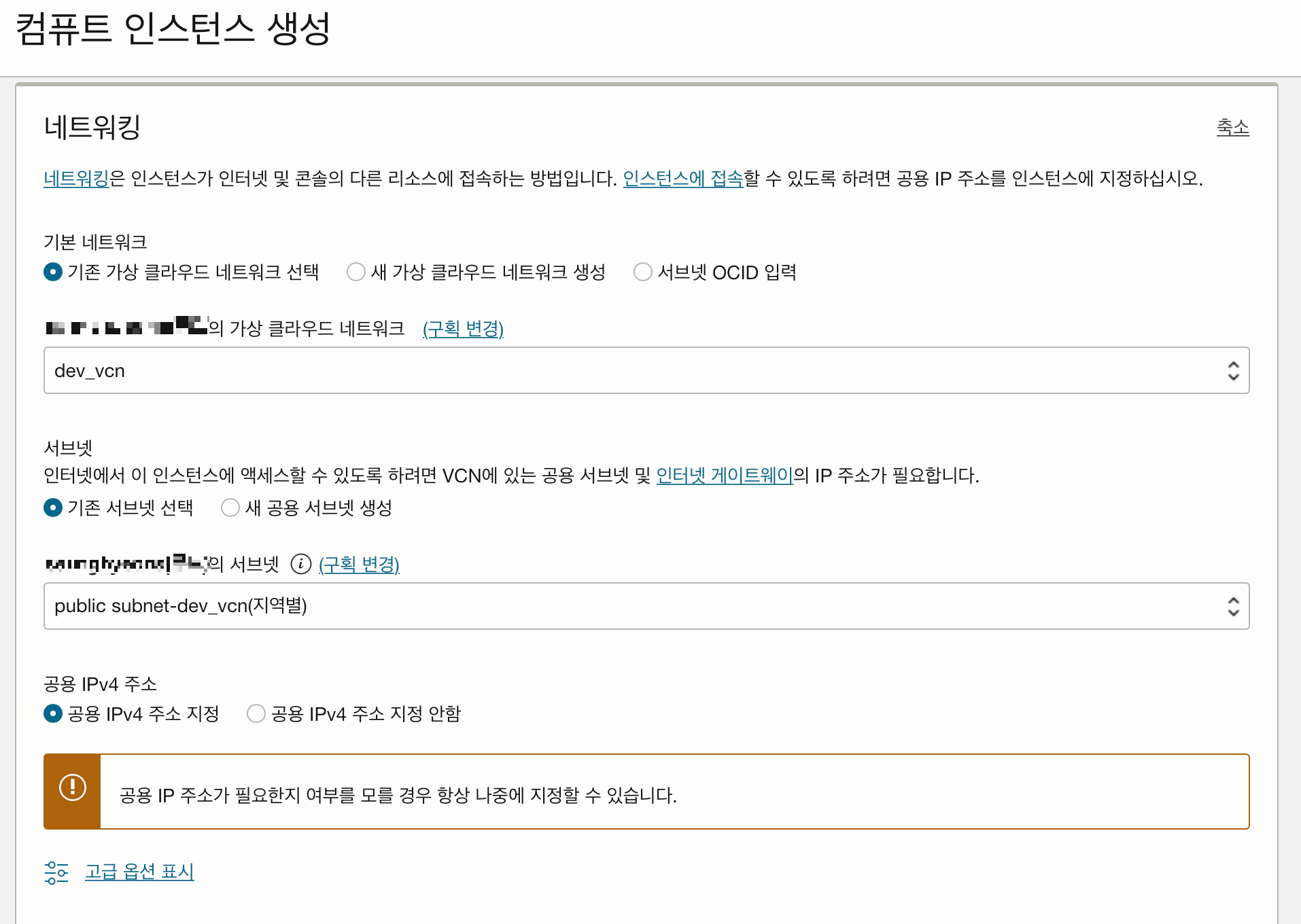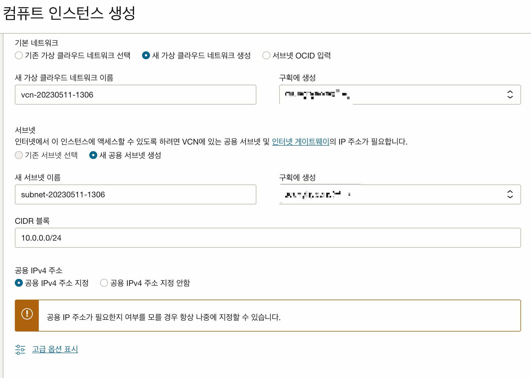 최초 인스턴스 생성이라면 가상 네트워크가 없기 때문에 '새 가상 클라우드 네트워크 생성'을 클릭해서 진행