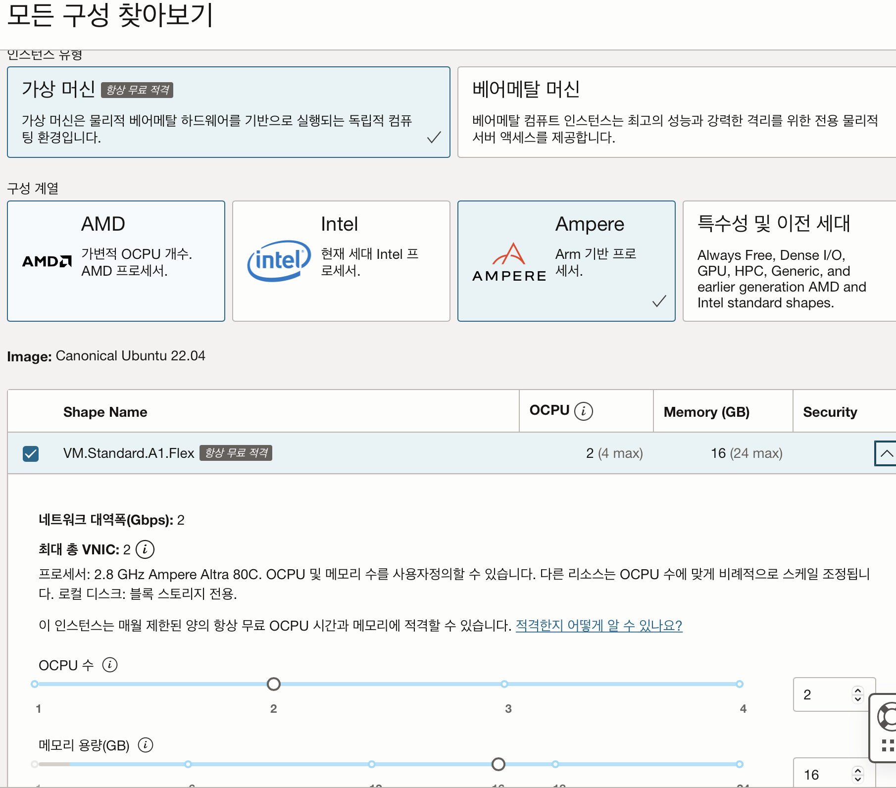 프리티어에서 사용가능한 가상머신은 기본으로 선택되는 특수성이전세대 와 Ampere 인데