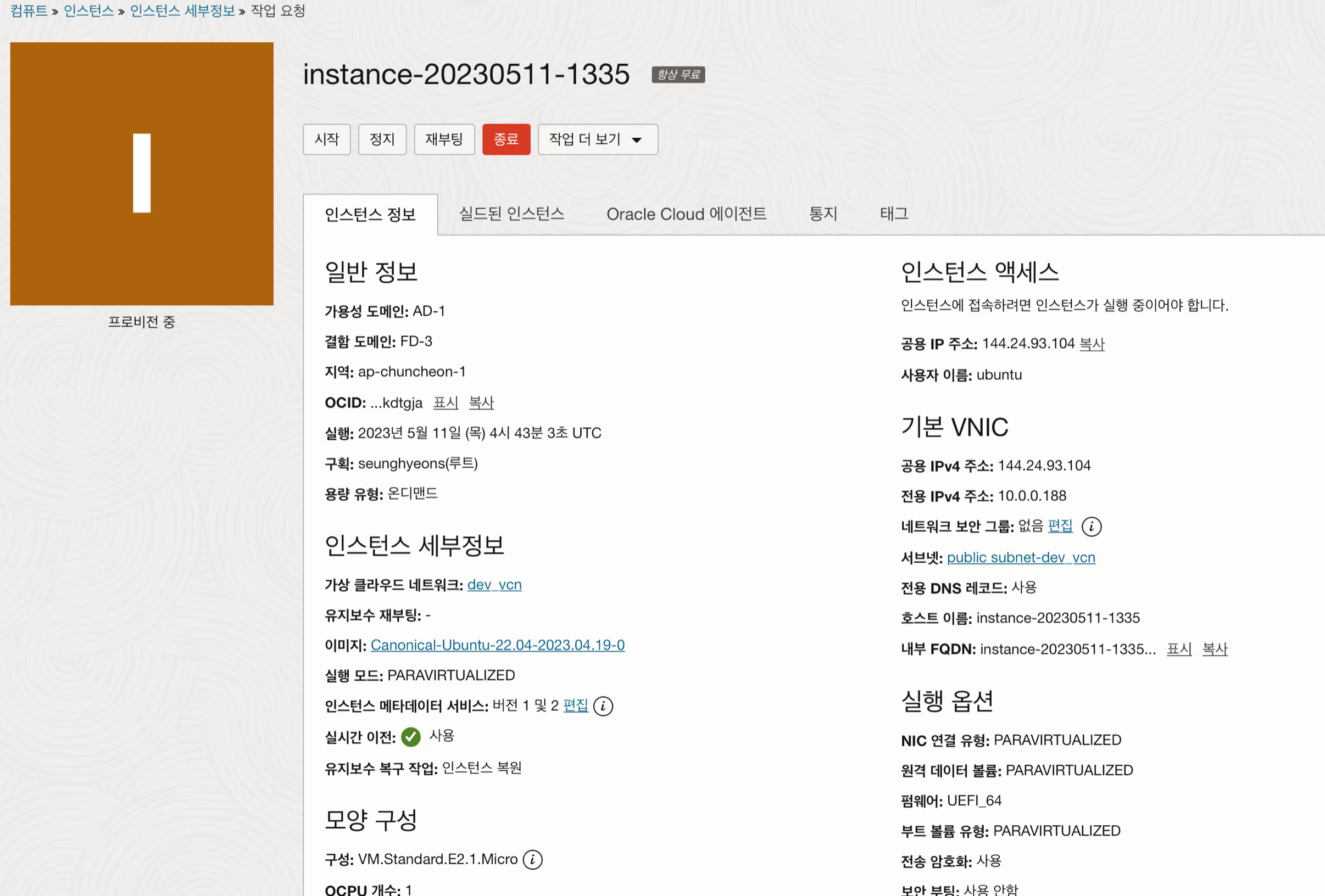 모든 내용을 잘 따라왔으면 이제 생성 버튼을 눌러 인스턴스 생성이 잘 되는지 확인해보자