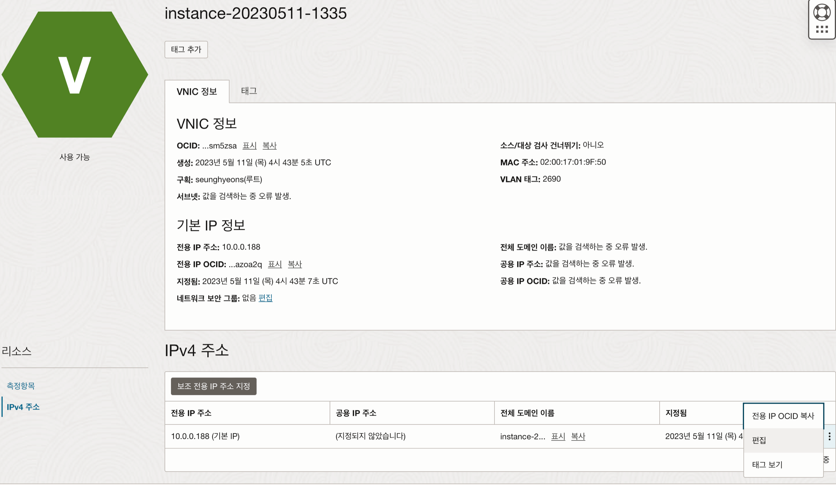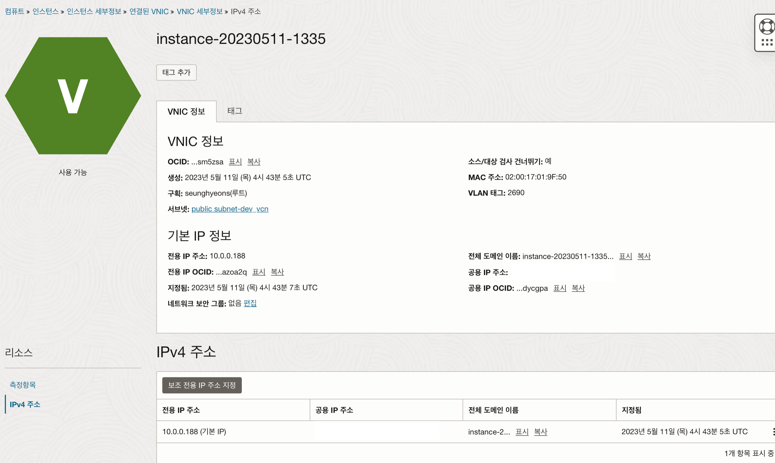 VNIC 세부정보로 들어와 왼쪽 하단의 IPv4 주소 메뉴를 눌러
