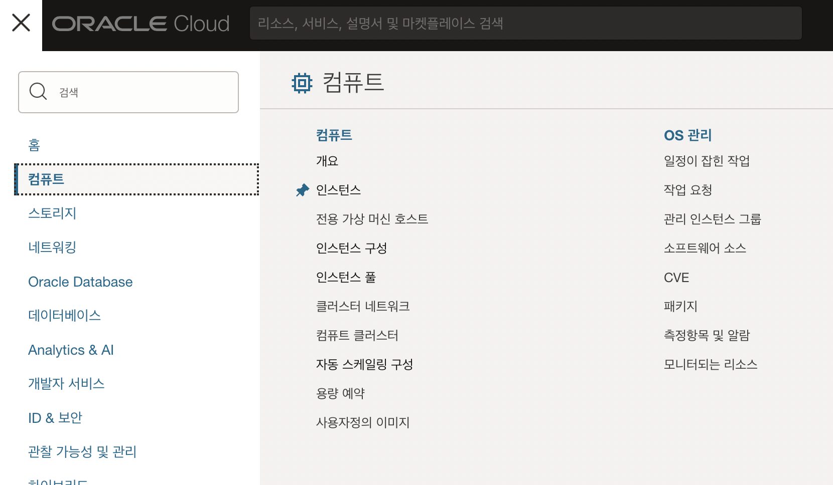 우리가 생성한 오라클 클라우드 계정으로 로그인해서 메뉴들을 살펴보면