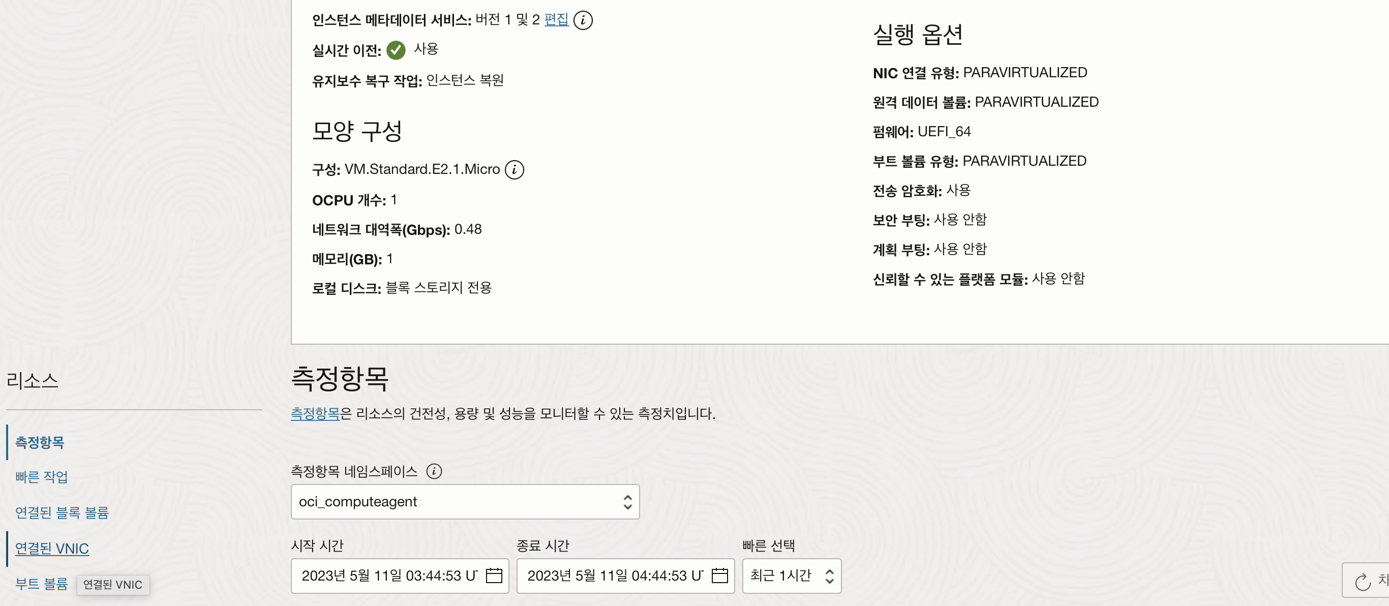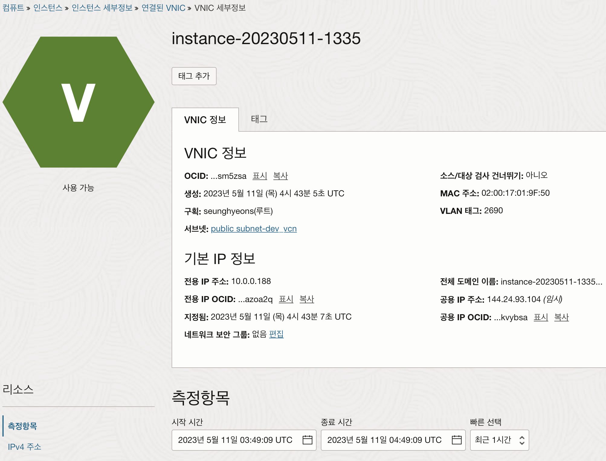 실행중인 인스턴스의 왼쪽 하단에 있는 연결된 VNIC 메뉴를 클릭