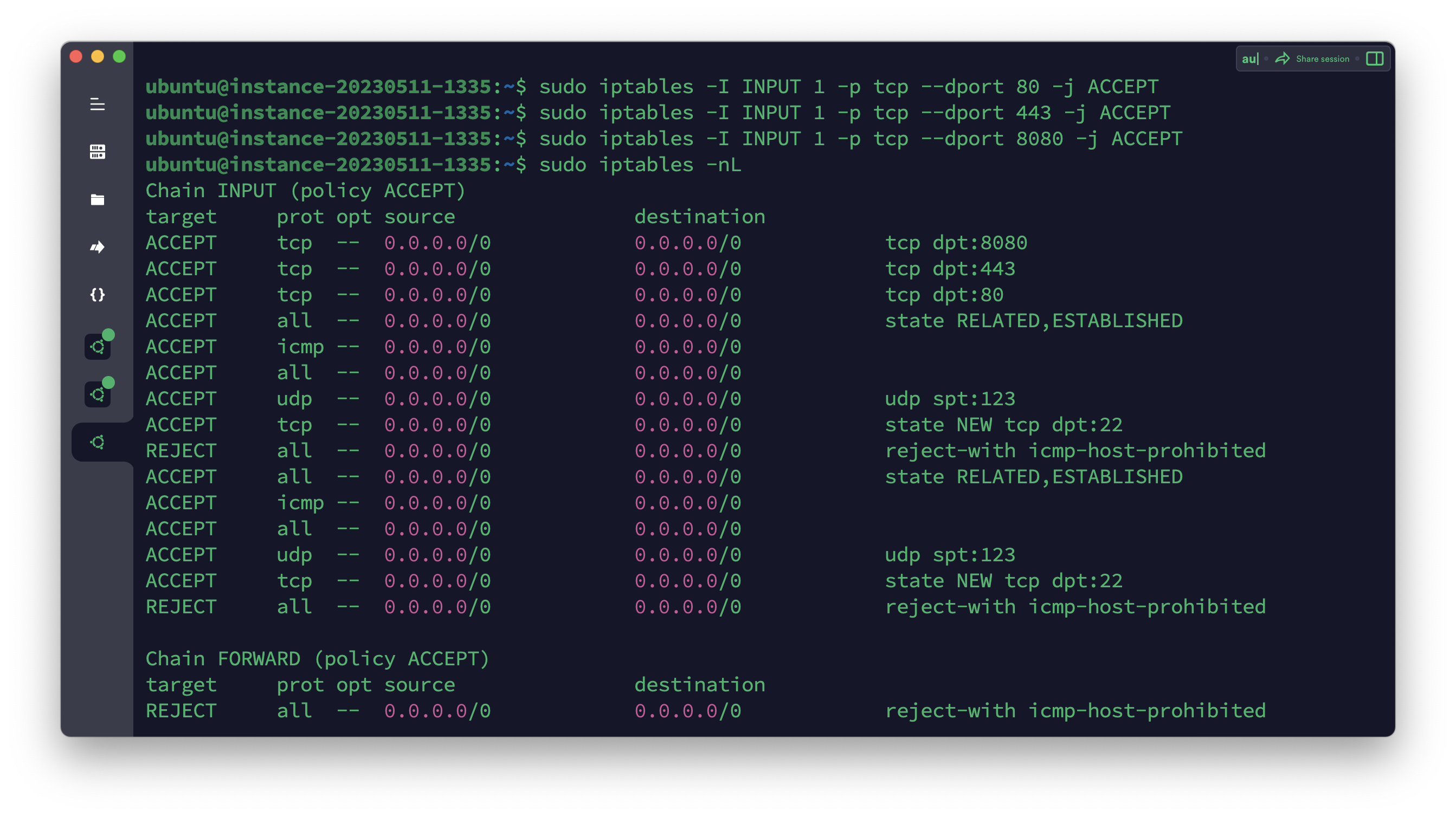 sudo iptables -S | grep 443 # 뒤에 포트 변경해주면 확인 가능하다