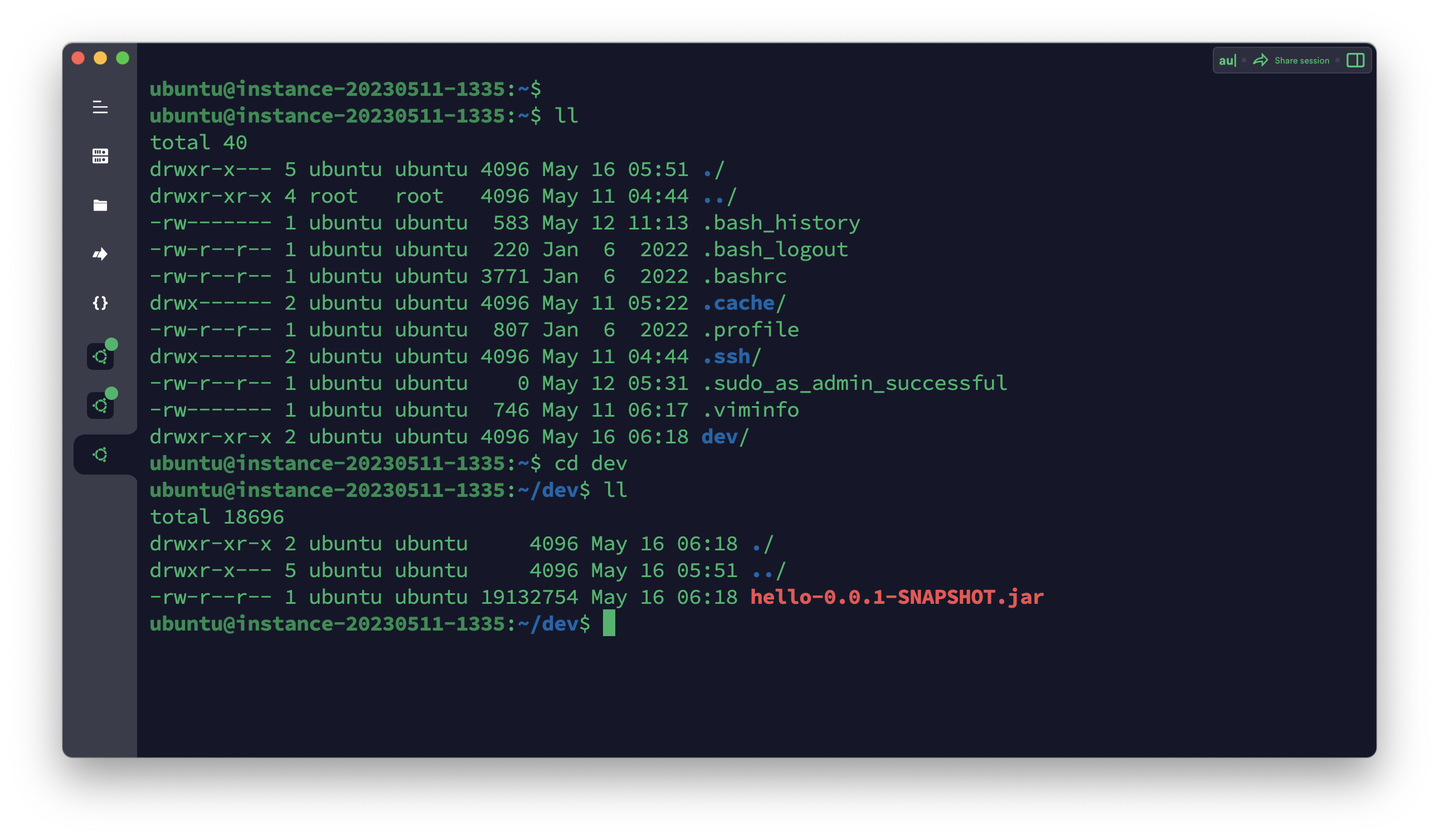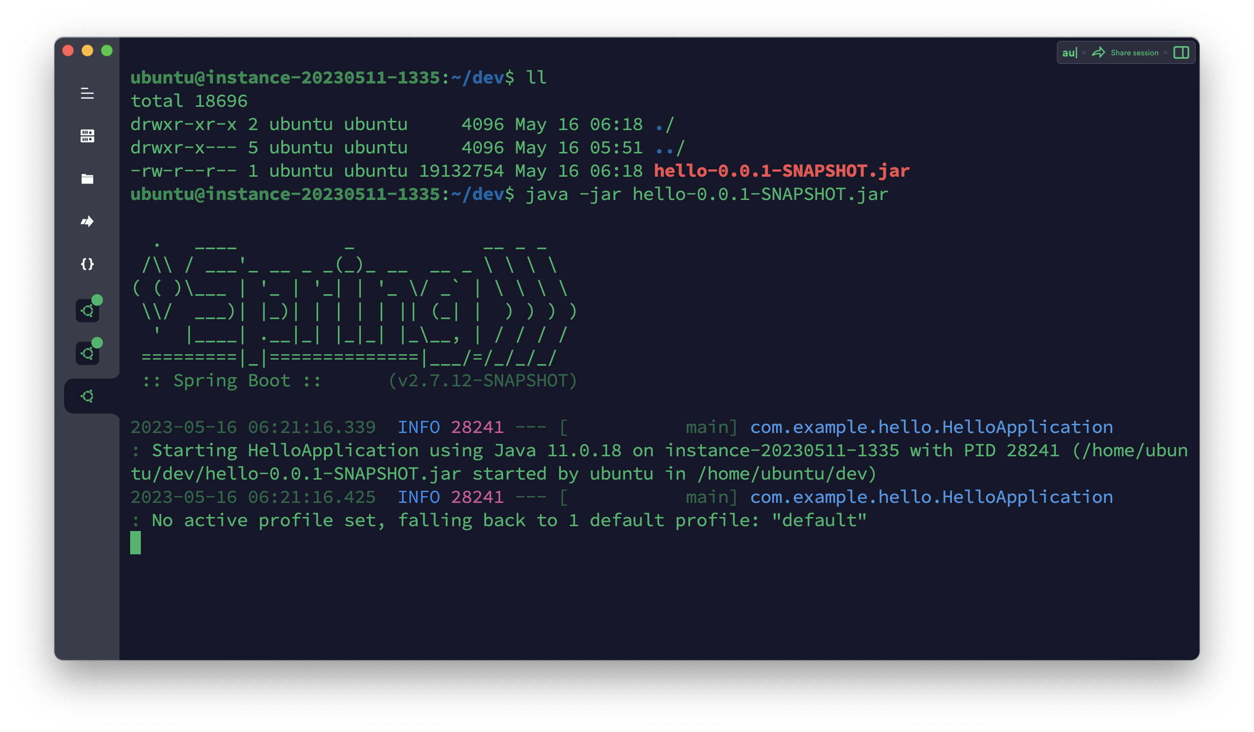 실행중인 스프링 부트를 종료하기 위해서는 SSH접속 화면에서 ctrl + c 를 눌러 바로 종료도 가능하고