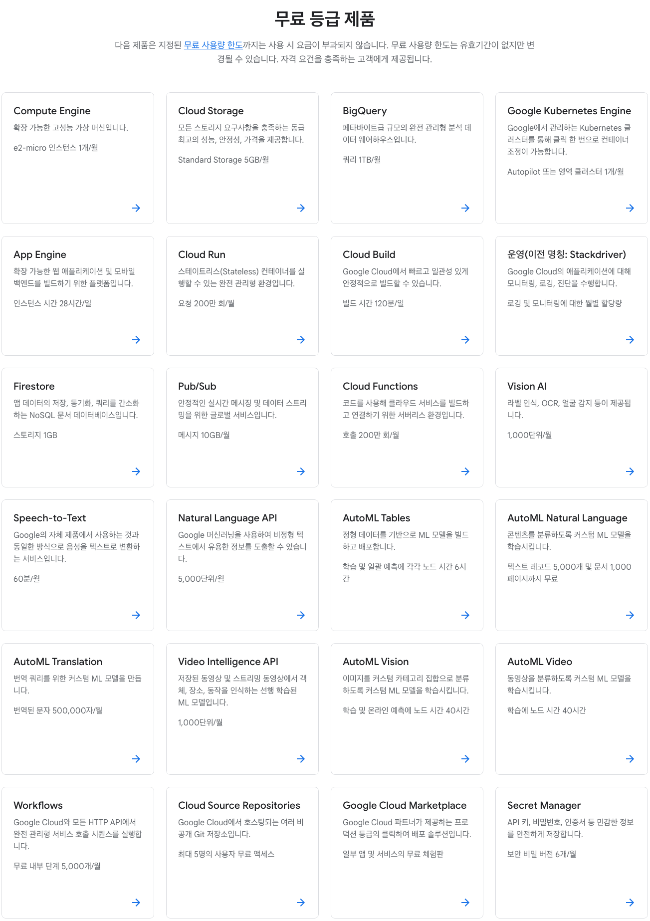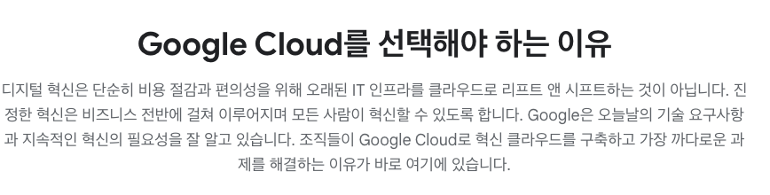 - 가상 머신(VM) 인스턴스, 스토리지, 데이터베이스, 네트워킹, 서버리스 컴퓨팅(Google Cloud Functions) 등의 다양한 서비스 제공 - 필요에 따라 리소스를 확장할 수 있는 유연성 - 머신러닝 및 인공지능 기능을 일부 무료로 이용 가능. TensorFlow, BigQuery ML, Vision API, Speech-to-Text API 등을 활용해 데이터 분석 및 머신러닝 수행 가능 |