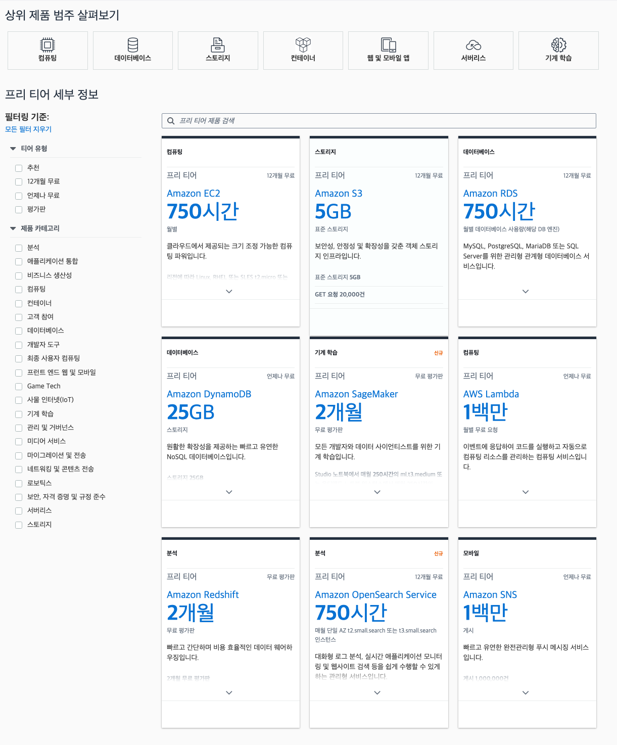 | 단점 | - 일부 서비스에는 사용 시간 제한이 있거나 제한된 리소스 용량이 할당. 초과 사용 시 추가 비용이 발생 - 일부 서비스는 기능이나 용량 측면에서 제한 |